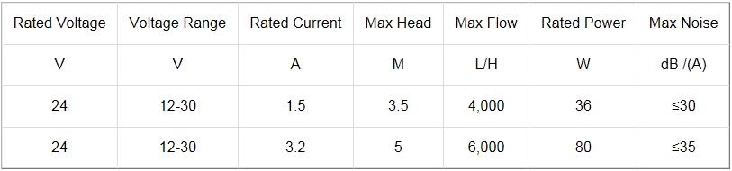 Rated Voltage | Voltage Range | Rated Current | Max Head | Max Flow | Rated Poweer | Max Noise |
